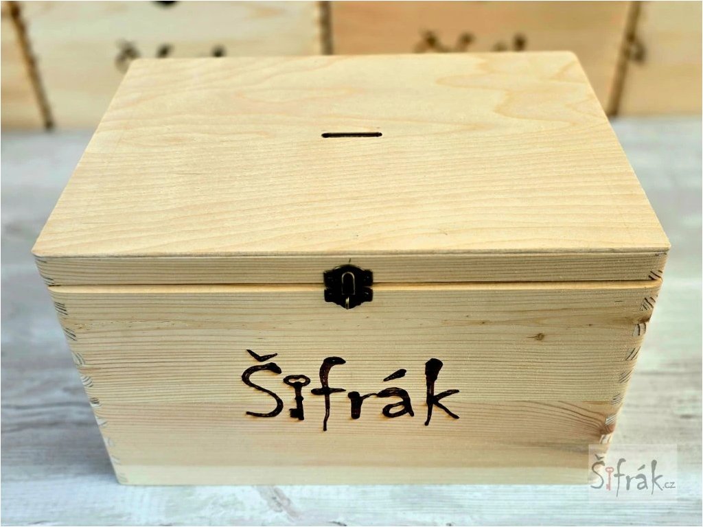 Ve spolupráci s Šifrák.cz jsme pro Vás připravili možnost této dárkové bedny, do které můžeš přiobjednat naše pytlíky a nebo si ji naplnit sám čímkoliv. Aby se do bedny obdarovaný dostal musí vyluštit přiloženou šifru střední obtížnosti 15+, čímž odemkne zámek a dostane odměnu. Bedna do budoucna lze použít například jako velká kasička.