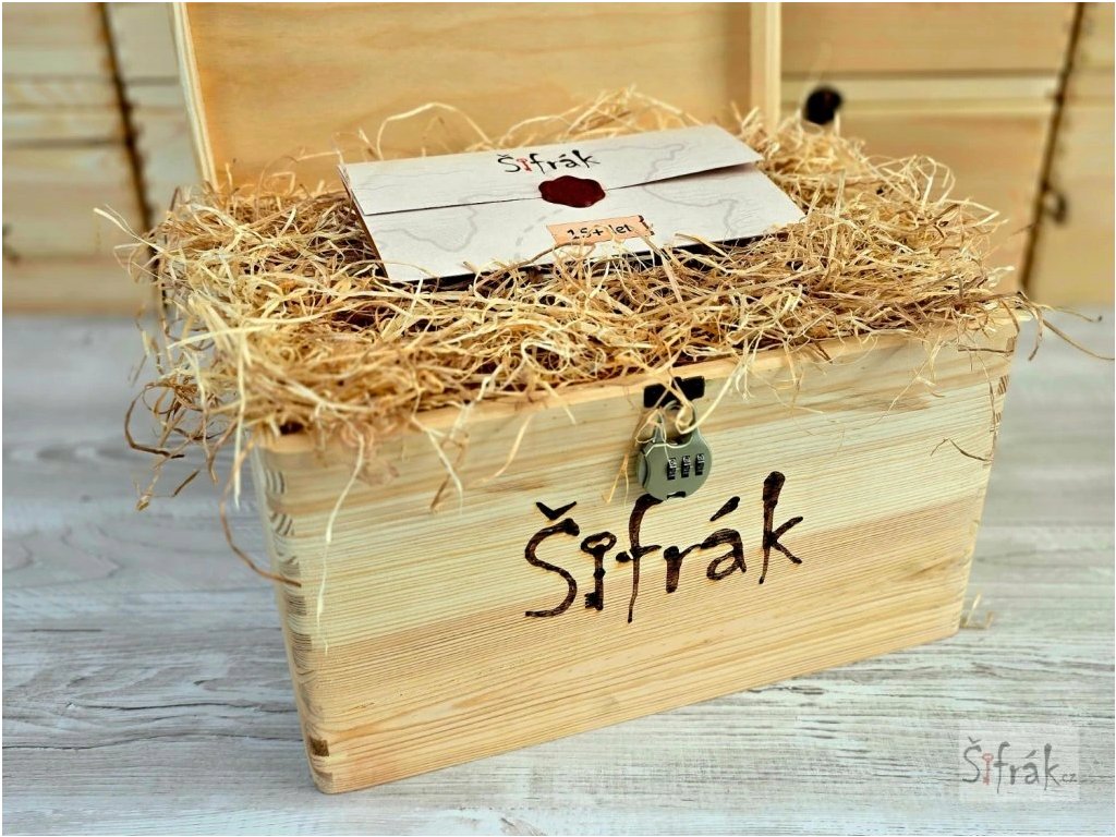 Dárková bedna se zážitkem od sifrak.cz. Šifra střední obtížnosti pro 15+, obsah podle tvého výběru.
