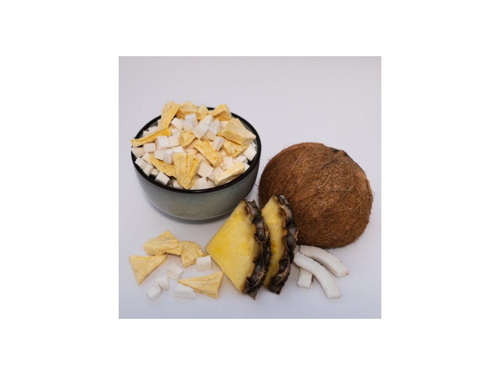 Díky šetrné lyofilizaci zůstává každá kostička krásně bílá, voňavá a sladká. Křupne, rozvoní se a na chvíli vás vezme na pláž pod šumící palmy.